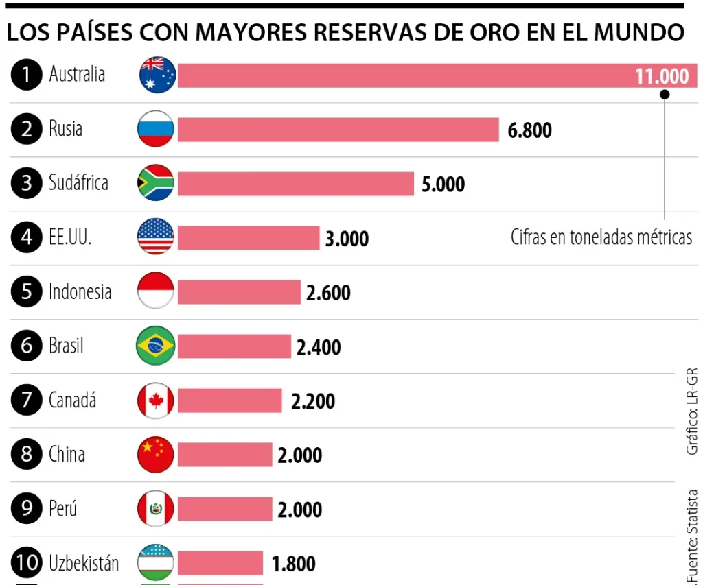 Es importante distinguir entre reservas de oro y producción minera. Países como China, Australia y Rusia son grandes productores de oro, pero no siempre coinciden con los países que tienen mayores reservas almacenadas en sus bancos centrales.